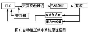 典型的自動恒壓供水系統的結構框圖如圖1所示;系統具有控制水泵出口總管壓力恒定、變流量供水功能,系統通過安裝在出水總管上的壓力傳感器、流量傳感器,實時將壓力、流量非電量信號轉換為電信號,輸入至可編程控制器(PLC)的輸入模塊,信號經CPU運算處理后與設定的信號進行比較運算,得出最佳的運行工況參數,由系統的輸出模塊輸出邏輯控制指令和變頻器的頻率設定值,控制泵站投運水泵的臺數及變量泵的運行工況,并實現對每臺水泵根據CPU指令實施軟啟動、軟切換及變頻運行。系統可根據用戶用水量的變化,自動確定泵組的水泵的循環運行,以提高系統的穩定性及供水的質量。